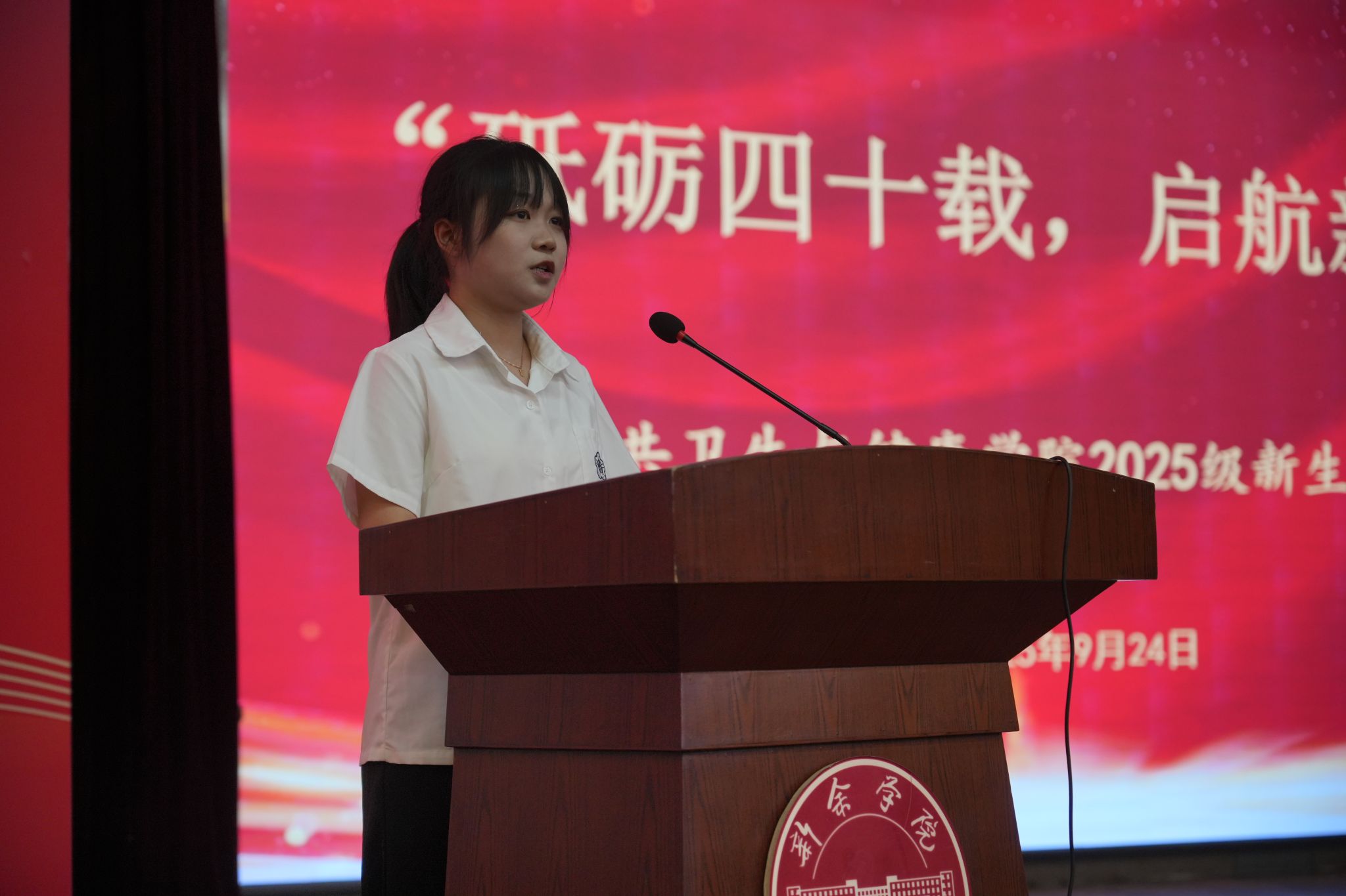 教师代表唐远强博士结合自身深耕教学科研领域的经历,以“四十载底蕴育新人”为切入点,勉励新生们依托学院深厚的学科积淀,将个人学业规划与学校发展、国家需求紧密结合,在追逐自我价值的过程中为母校增光添彩,为公共卫生事业注入新鲜活力。