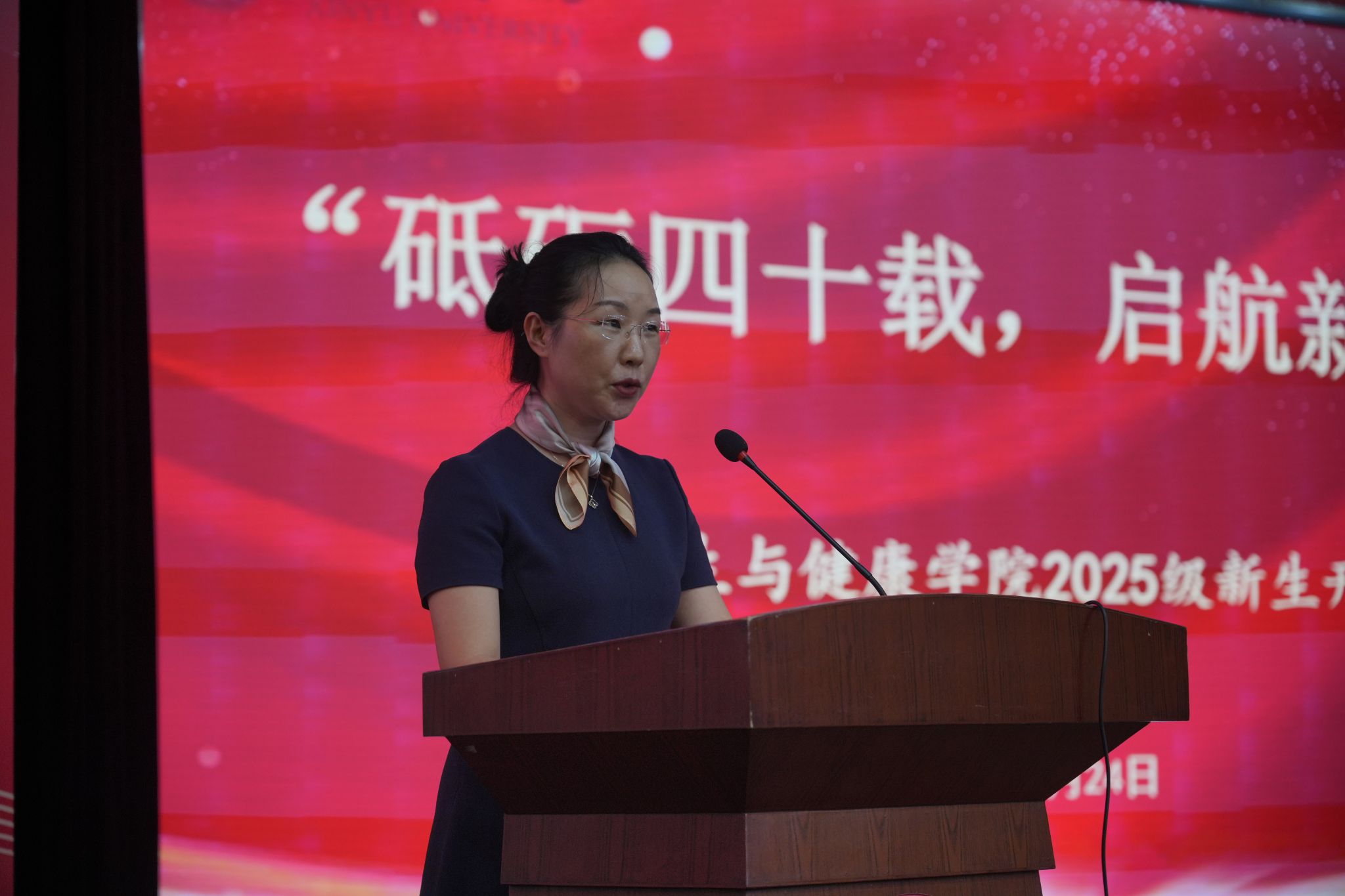 随后,经理占星新以《医者的时代使命》为题讲授“开学第一课”。她深入解读了“教以惠生,学以达仁”的院训内涵,强调在健康中国战略背景下,当代医务工作者的责任与担当。她嘱咐新生们要以学院四十载发展历程中的优秀前辈为榜样,与学院同心同向、载梦启航,未来扎根医疗一线、深耕服务患者的初心,用大爱与专业诠释新时代医者的使命,为公共卫生与健康事业的“新篇章”贡献力量。