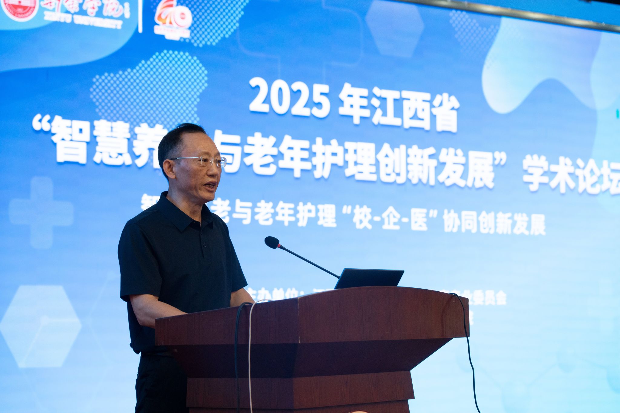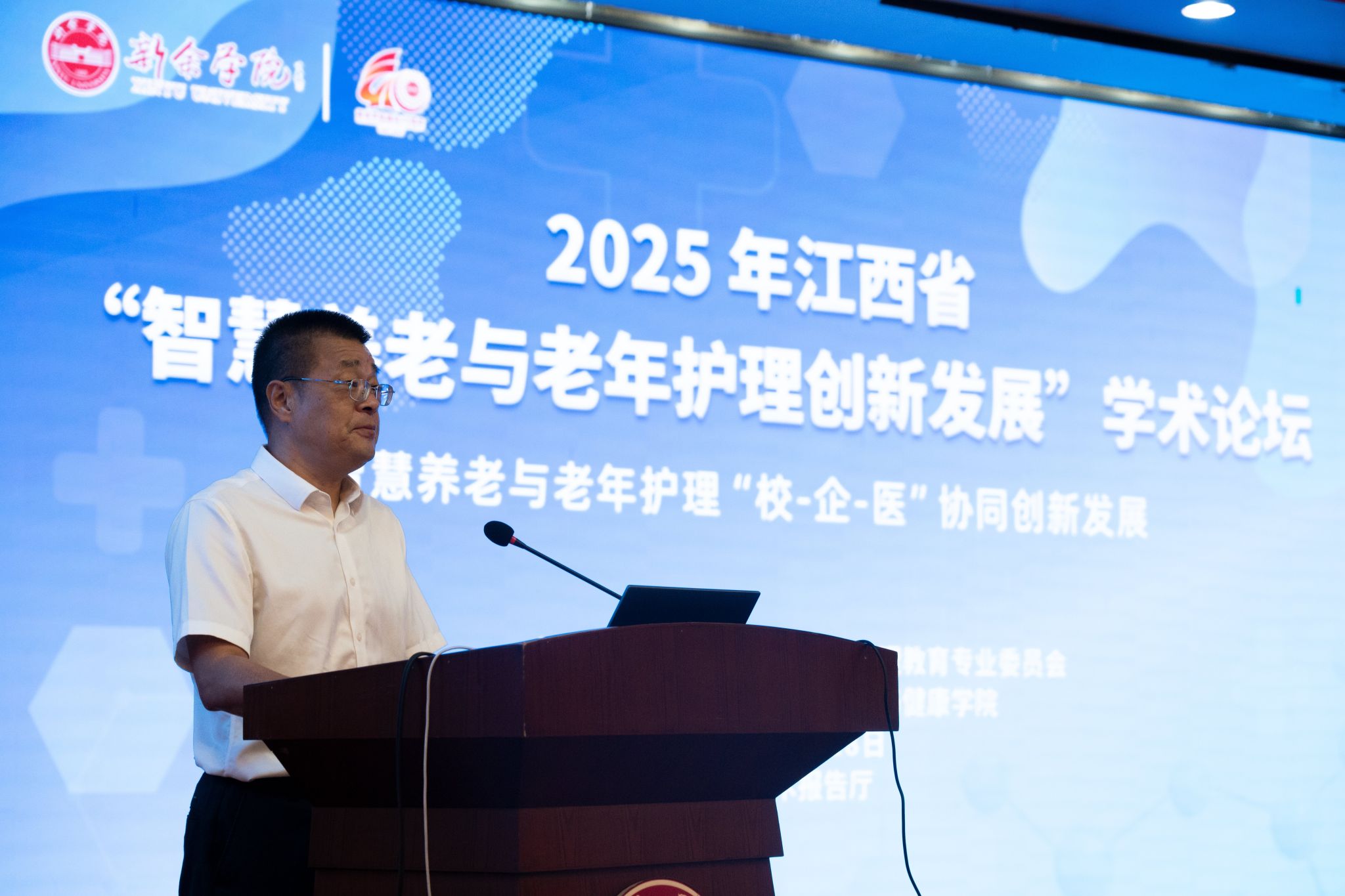 廖建全对本次学术论坛表示热烈祝贺,并指出本次学术会议主题高度契合了国家战略导向和新余市的实际需求,涵盖了智慧养老新模式、老年护理人才培养、前沿技术应用等关键领域,为推动新余市养老与护理事业的高质量发展,提供宝贵的智力支持和创新思路。