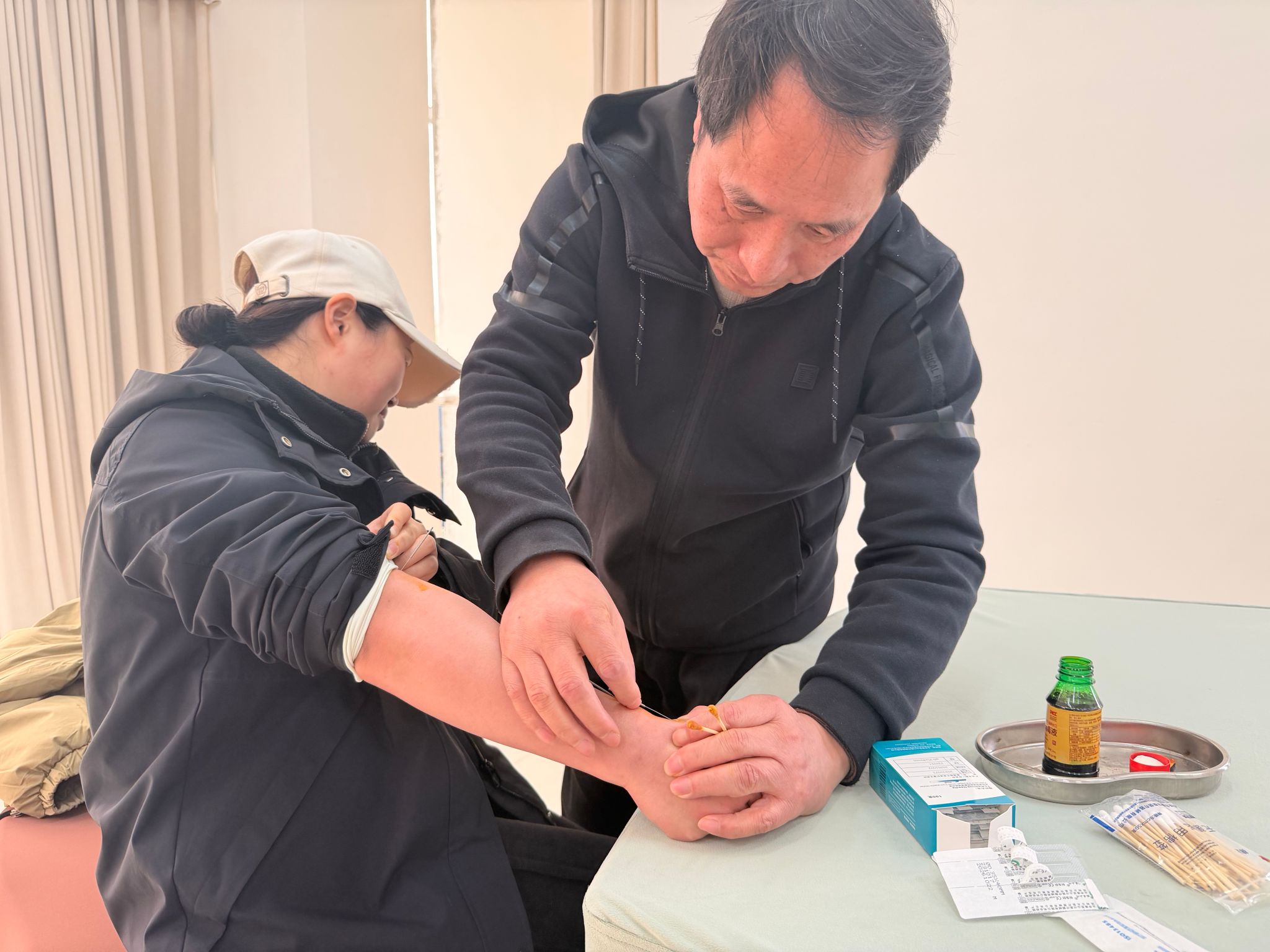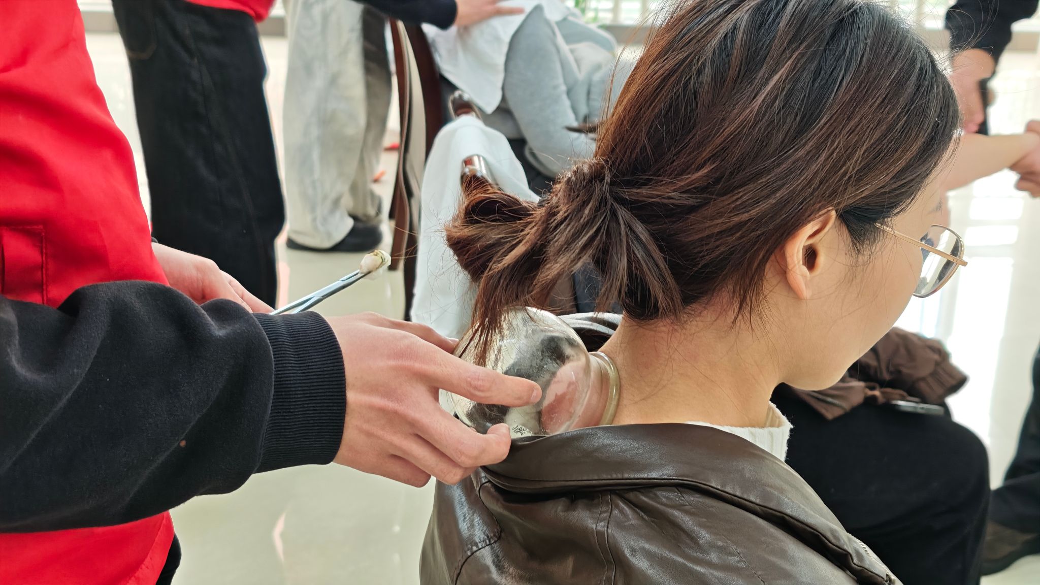 活动现场暖意融融,康复治疗学教研室李主任李琪亲临现场坐诊,为有需要的女教师辨证施针,精准调理各类慢性劳损与疑难不适。康复治疗学专业的员工志愿者们充分发挥专业所长,化身专业治疗师,为女教师们提供针对性的肩颈推拿、刮痧、拔火罐、理疗设备体验等志愿服务,有效缓解了老师们长期伏案工作带来的肌肉僵硬与身体疲惫。随后,李琪还带领全体女教师共同练习八段锦,以舒缓柔和的传统养生功法,帮助大家疏通经络、放松身心、调养精气神。