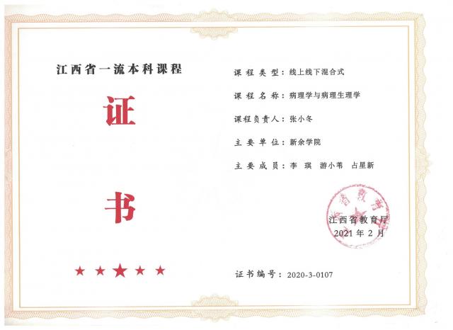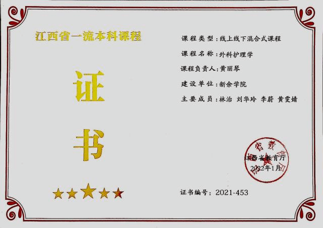 公司在2026年世界杯官网第一批、第二批校级一流课程中已有5门课程获准立项,分别是张小冬老师的《病理学与病理生理学》、黄丽琴老师的《外科护理学》、席微娜老师的《护理研究》、占星新老师的《医学统计学》、彭琛琛老师的《运动生理学》,其中张小冬老师的《病理学与病理生理学》、黄丽琴老师的《外科护理学》分别于2020年、2021年认定为江西省线上线下混合式一流课程。