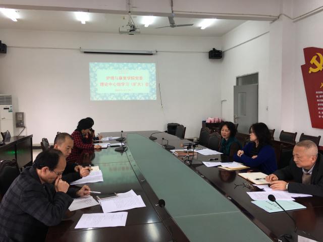 3月29日,护理与康复学院在该院一楼会议室举行党委理论中心组学习(扩大)会,集体学习了习近平总书记在全国两会期间下团组重要讲话精神和学校思想政治理论课教师座谈会上的重要讲话精神、全省市厅级主要领导干部坚持底线思维着力防范化解重大风险专题研讨班会议精神,以及进一步深入学习贯彻《关于全面深化新时代教师队伍建设改革的意见》等文件精神。学院班子成员及各科室负责人参加了学习活动,班子成员围绕学习内容作了主题发言。