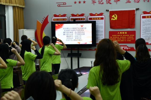 4、团支部书记带领新团员宣誓,老团员重温入团誓词。