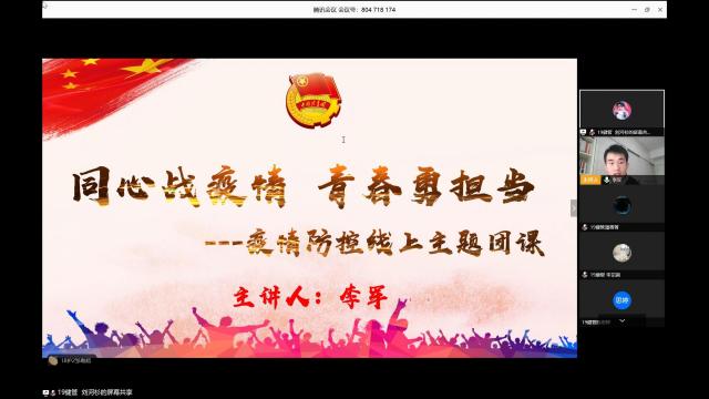 当前,新冠肺炎疫情的防控工作正处于关键时刻,为进一步贯彻落实习近平总书记关于新冠肺炎疫情防控工作的系列重要讲话和重要指示精神,激发广大青年员工的责任担当,护理与康复学院于3月17日下午在腾讯会议组织开展疫情防控线上主题团课,本次团课由辅导员李军老师主讲,同时邀请了部分青年代表进行分享,学院共计300余名团员参加。