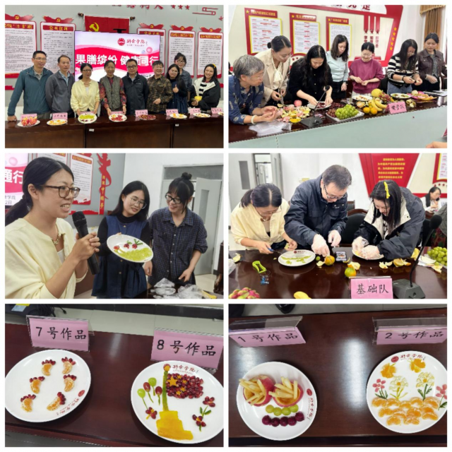 活动当天,学院的会议室内热闹非凡,色彩斑斓的果膳拼盘与欢声笑语交织成一幅生动的画面。在轻松愉快的氛围中,教职工们被分成多个小组,每个小组都充满热情地投入到果蔬膳食的创作中,老师们纷纷发挥创意,精心设计和制作。经过紧张而有趣的创作与评选,最终8组作品凭借其独特的创意、精美的造型以及营养均衡的搭配脱颖而出,获得了老师们的一致好评。