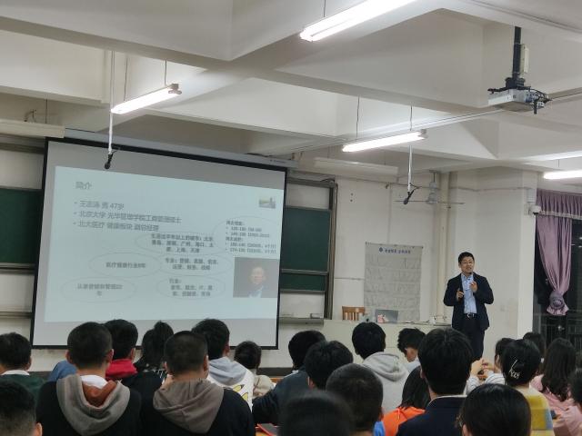 本次讲座在占星新的主持下有序进行。首先王志涛向我们分享了自己的人生经历,并提出了有关健康的问题。指出了肥胖人数增加及因相关疾病剧增人们对健康需求的增加。人民健康对整个国家的发展具有重大意义,王志涛鼓励我们要养成良好的作息习惯,自律生活。接着提出了大健康行业和医疗大健康行业与本专业的联系,并讲述了本专业的行业前景。