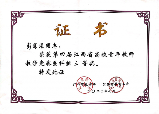 2020年7月30日至31日,由江西省教育厅、江西省教育工会联合主办,江西财经大学承办的第四届江西省高校青年教师教学竞赛在南昌举行。公司选派的彭琛琛老师在决赛中表现优异,喜获医科组三等奖的佳绩。