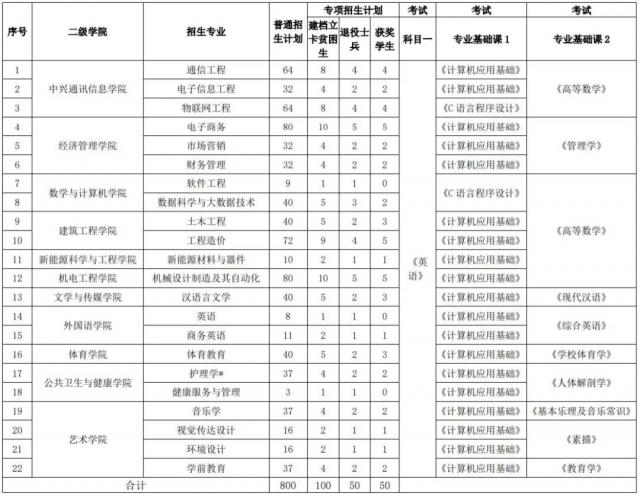 “专升本”招生专业计划及考试科目一览表