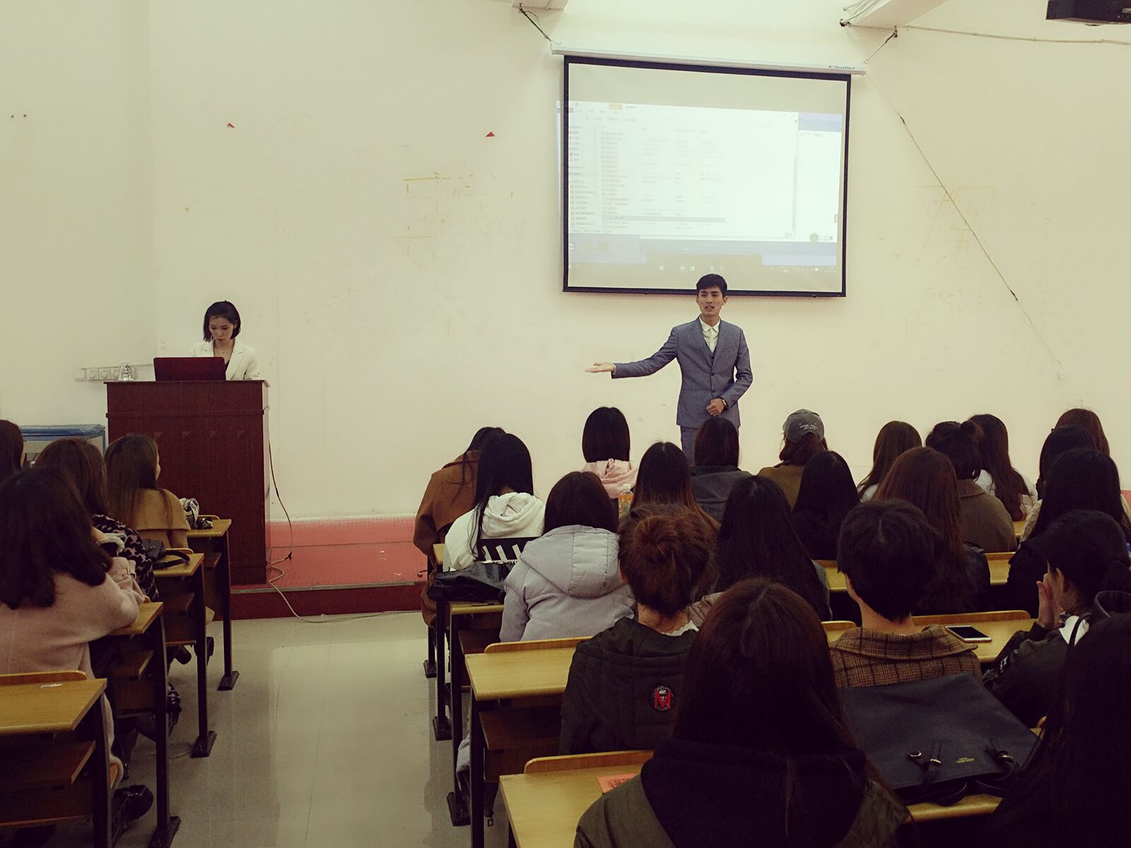首先由花盛公司帅气的教官讲话并热情的与同学们互动。接下来由花盛公司教育部长余禹瑾向在场同学们分享自己在花盛的奋斗经历,在花盛实现了自己很多的第一次,向同学们展示了一个有实力,有严格,有质量,有情怀的企业。并且向在坐的同学抛出了橄榄枝。